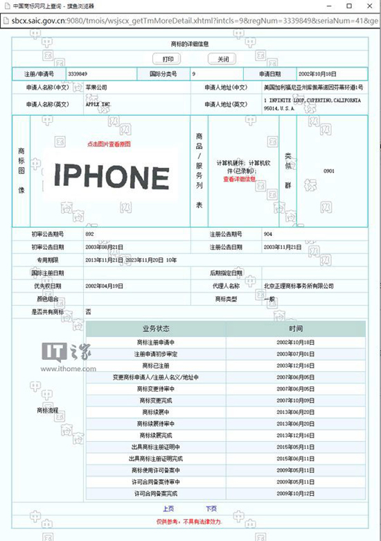 Apple подала заявку на регистрацию торговой марки «iPhone» в Китае в 2002 году, а стала ее полноправным владельцем в ноябре 2013 года. Однако в документах упоминается лишь компьютерное оборудование и программное обеспечение.
