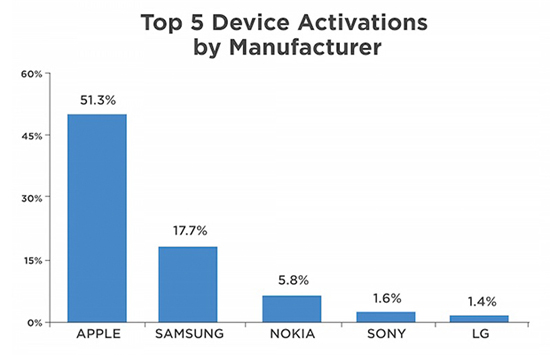 На третьем месте по количеству активаций идет Nokia – 5,8%. Замыкают пятерку Sony и LG с показателями 1,6% и 1,4% соответственно.