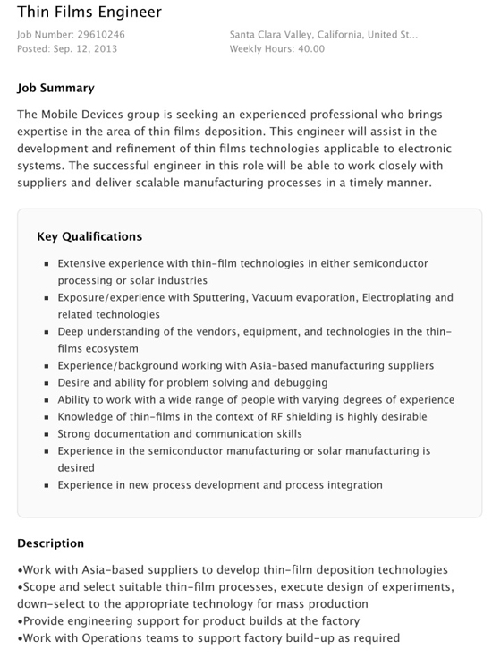 Судя по новой размещенной вакансии, Apple планирует начать разработки в области применения тонкопленочных солнечных технологий для будущих мобильных устройств. На официальном сайте компании было размещено объявление о поиске инженера с опытом работы в солнечной индустрии. Инженер должен войти в команду Apple, чтобы «принимать участие в разработке и совершенствовании технологии тонких пленок применяемых к электронным системам.
