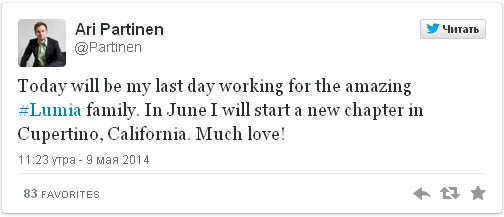 Вчера в своем twitter, Ари Партинен, главный фото эксперт компании Nokia, сообщил, что он уходит на работу в Apple. Все эксперты в один голос твердят о том, что камера у iPhone является одной из лучших, однако камеры PureView также оценивается очень и очень высоко, и именно за них отвечал Ари. С июня месяца этот профессионал своего дела будет колдовать над камерами в iPhone, что очень радует.