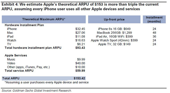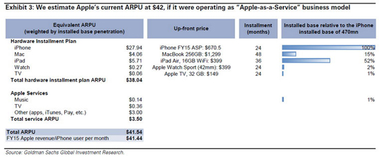 Теоретически, Apple могла бы перевести и другие свои продукты на планы с ежемесячными выплатами и добавить к ним платежи за использование Apple TV и Apple Music. Мы считаем, что потенциально телевизионный сервис от Apple может стать ключевым в превращении ее в сервисную компанию. Аналитики Goldman
