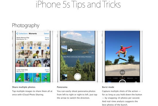 Компания Apple добавила на свой сайт раздел «Советы и подсказки», чтобы научить пользователей возможностям, которые они могут обнаружить в iPhone 5s, iPhone 5c и iPhone 4S. На сайте подробно описываются эксклюзивные функции последних моделей смартфонов, а также усовершенствования, появившиеся в операционной системе iOS 7.