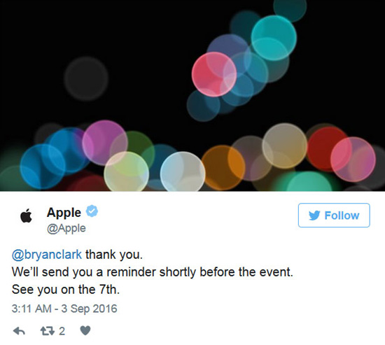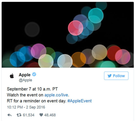 Вот и сейчас в ленте у пользователей может появиться сообщение от авторизованного аккаунта Apple о том, что 7 сентября можно будет посмотреть презентацию, с предложением ретвитнуть и получить напоминание перед самим ивентом. Сообщение выглядит примерно так: