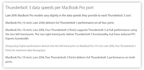 «Всегда подключайте высокопроизводительные устройства к разъемам на левой стороне MacBook Pro (13-дюймовый, 2016 год, четыре порта Thunderbolt 3) для получения максимальной пропускной способности», – указывает Apple в документе.