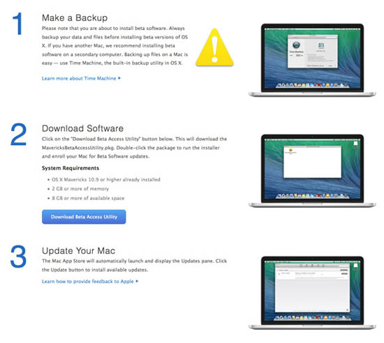 Чтобы загрузить бета-версию нового выпуска OS X, необходимо пройти регистрацию на специальной странице. Пользователь должен иметь действующий аккаунт Apple ID, подтвердить свое участие в программе и загрузить специальную утилиту «Beta Access Utility». Apple рекомендует перед установкой тестовых сборок OS X выполнить резервное копирование всей информации на ПК с помощью Time Machine.