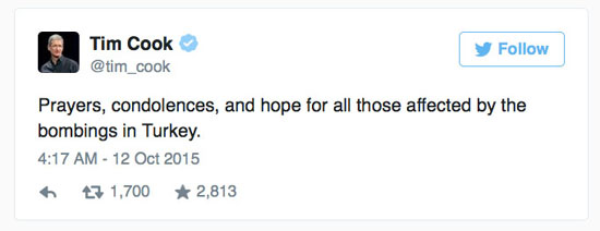 Террористическая атака произошла в Анкаре в субботу, 10 октября. В столице Турции прогремели два взрыва перед началом митинга, организованного в знак протеста против всплеска насилия из-за турецко-курдского конфликта на юго-востоке страны. Погибли 97 человек, более 500 получили ранения. Глава Apple Тим Кук выразил соболезнования в связи с терактом. «Наши молитвы, соболезнования и надежды для всех тех, кто пострадал от взрывов в Турции», – написал он в своем твиттере.