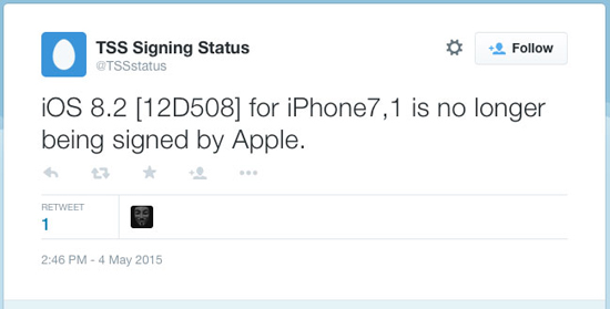 В последнее время Apple взяла за правило подписывать старые прошивки еще в течение нескольких недель после релиза новой. На на этот раз срок оказался рекордным: окно закрылось почти через два месяца – компания перестала выдавать цифровые сертификаты для iOS 8.2 в понедельник, 4 мая.