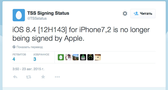 В последнее время Apple взяла за правило подписывать старые прошивки еще в течение нескольких недель после релиза новой. На этот раз окно закрылось через 10 дней – компания перестала выдавать цифровые сертификаты для iOS 8.4 в воскресенье, 23 августа.