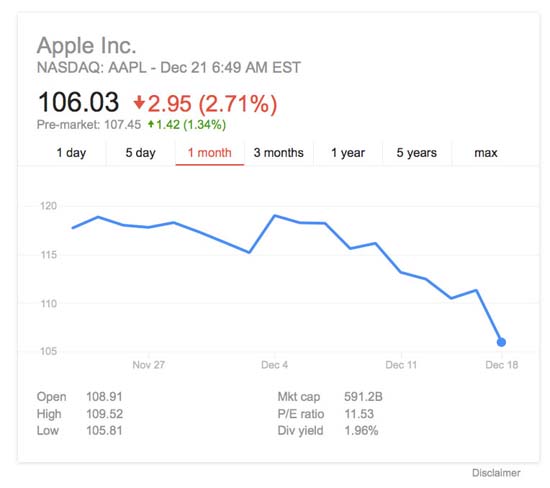 На прошлой неделе ценные бумаги Apple оказались в красной зоне и выходить из неё не спешат. Акционеров не обрадует график курса акций ни за этот день, ни за последнее полугодие. Наивысшая стоимость была достигнута с февраля по июль, и с тех пор стоимость акций снижается, лишь в начале ноября подобравшись к $125. Нижняя точка была достигнута в августе, когда акции стоили $103. Сейчас цена очень близко подобралась к этому минимуму – около $106.