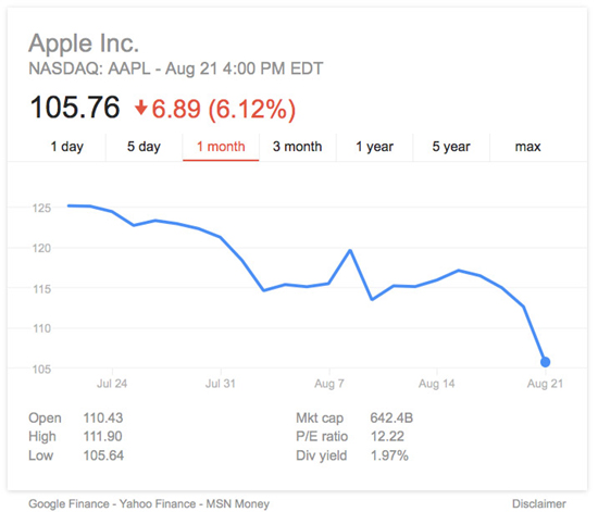 Только за 21 августа, когда биржевые индексы понизились, отреагировав на новость о сокращении темпов роста фондового рынка Китая, акции Apple подешевели на 6,89%. К концу сессии их цена составила $105,76 за штуку. В то же время еще не так давно в этом году они продавались по $134,5 за акцию.