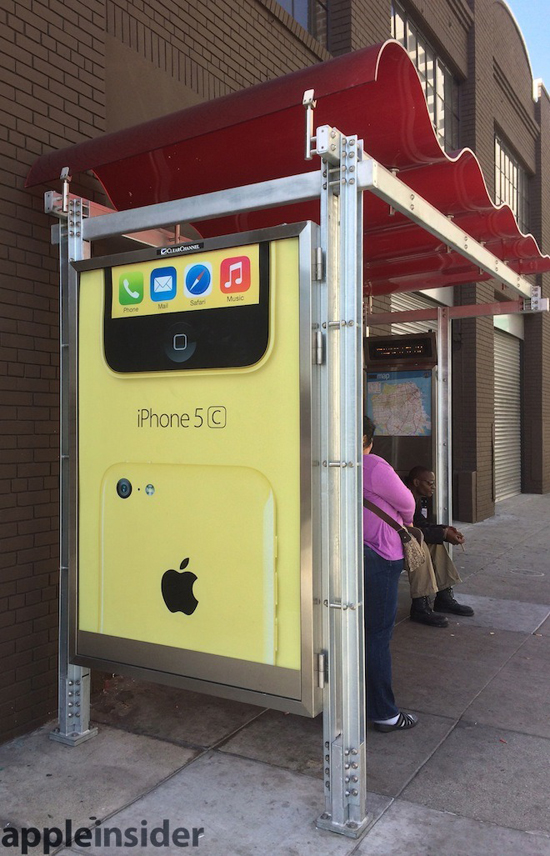 В итоге покупатель не понимает необходимость покупки iPhone 5c, а Apple вынуждена постоянно напоминать о существовании пластиковой и цветастенькой версии своего смартфона. Во многих городах Европы и Северной Америки можно найти рекламу iPhone 5c на остановках городского общественного транспорта. Выглядит она так: