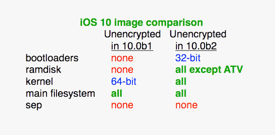 По словам известного джейлбрейк-разработчика MuscleNerd, в iOS 10 beta 2 компания Apple раскрыла несколько новых компонентов операционной системы. В их числе Bootloaders (32 бита), Ramdisk, а также kernel (32 и 64 бита).
