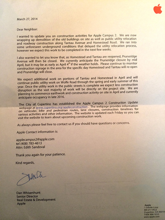 Мы подходим к строительству нашего кампуса с той же заботой и вниманием к деталям, какие уделяем любому продукту Apple. Мы также ценим ваше мнение. Если у вас есть какие-то вопросы или комментарии или вы хотите больше узнать об Apple Campus 2, пожалуйста, отправьте письмо по обратному адресу. Вы можете также зайти на сайт города Купертино www.cupertino.org, чтобы получить исчерпывающую информацию об этом проекте».