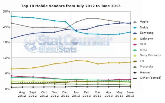 Разница минимальна — 25,47% против 25,09%, но она есть, и график показывает, что в ближайшем будущем, если Apple не предпримет серьезных шагов, она еще больше увеличится. Стоит вспомнить, что годом ранее Apple опережала Samsung с большим отрывом — 25,43% против 19,46%. На третьей позиции сейчас находится Nokia с 21,96%, которая пережила спад, однако начинает наверстывать упущенное.