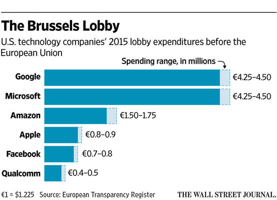 По данным организации Transparency International, по состоянию на сентябрь 2016 года в ЕС было зарегистрировано 9756 лоббистских организаций — больше чем в США, где их 9726. В последнее время ряд крупных американских топ-менеджеров, включая главу Apple Тима Кука и руководителя Google Сундара Пичаи, лично встречались с главой европейской антимонопольной службы Маргарет Вестейджер, чтобы объяснять позицию своих компаний по целому ряду вопросов.