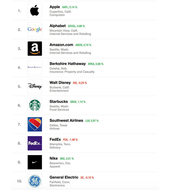 Второе место в списке «восхитительных» компаний досталось компании Alphabet, которая сместила на третье место Amazon. В топ-10 компаний также вошли Berkshire Hathaway, Walt Disney, Starbucks, Southwest Airlines, FedEx, Nike и General Electric.