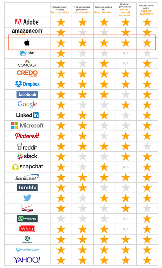 В 2013 году EFF присвоила Apple всего одну звезду. Однако за последнее время она изменила политику конфиденциальности в сторону прозрачности. Калифорнийская корпорация является членом коалиции по противостоянию слежке, которая выступает за то, что «государства должны снизить уровень слежки, использовать данные только для законных целей, не собирать данные об интернет-коммуникациях».