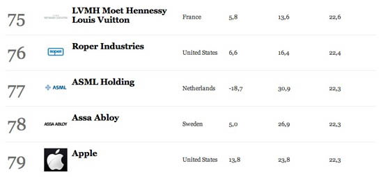 В 2011 году Apple заняла пятую строчку рейтинга Forbes, через год ее позиции снизились на 21 пункт, а в этом году упали еще на 58 строчек до 79 места в списке. Главный конкурент Apple, компания Google, тоже теряет позиции с 7 места до 24, а теперь до 47.
