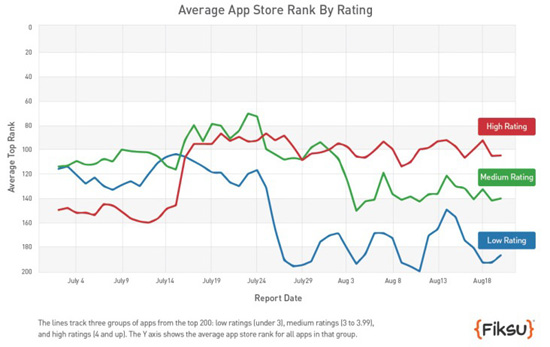 «В начале июля приложения не обладали четкой диверсификацией, но ближе к концу августа решения с высоким рейтингом оказались выше других среди выдаваемых результатов в App Store. Чем больше “звезд” у приложения, тем выше его рейтинг среди других аналогов», — сообщают специалисты Fiksu.