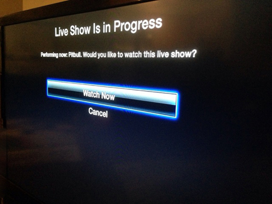 Apple тестирует новую систему уведомлений для телевизионных приставок Apple TV. В преддверии очередной трансляции iTunes Festival из Остина некоторые пользователи увидели на экранах своих телевизоров сообщение о начавшемся выступлении исполнителя Pitbull с предложением приступить к просмотру.