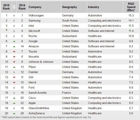 Доля доходов, которую Apple потратила на исследования и разработки (R&D) в 2015 финансовом году, оказалась значительно ниже, чем у ее конкурентов, свидетельствует отчет аналитической компании Strategy&. Несмотря на то, что за отчетный период компания существенно увеличила эту статью расходов, она тем не менее уступила по этому показателю таким компаниям, как Google, Samsung, Amazon и Microsoft.