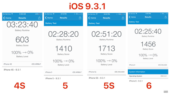 Тестирование проводилось с помощью бенчмарка, входящего в пакет Geekbench. Четыре телефона под управлением iOS 9.2.1 – iPhone 4s, iPhone 5, iPhone 5s и iPhone 6 – зарядили до 100% и запустили тест до полной разрядки устройств. Затем гаджеты обновили до свежей версии iOS 9.3.1 и повторили эксперимент. Полученные результаты сравнили на инфографике.