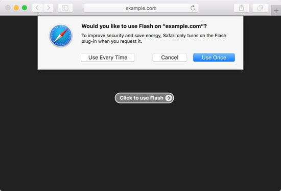 На месте контента будет отображаться заглушка и надпись «Нажмите, чтобы использовать Flash». При этом Safari будет запрашивать разрешение на запуск Flash-элементов на сайте. Пользователю будет предложено на выбор: запускать каждый раз или запустить только один раз.