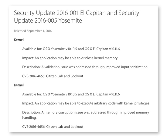Патч для настольных операционных системы Apple устраняет три опасные уязвимости, которые могли использоваться хакерами для установки вредоносного ПО. Речь идет о серии заплаток критических уязвимостей ядра, которые недавно были закрыты в операционной системе iPhone и iPad с выпуском iOS 9.3.5. Последние открывали доступ к контактам, сообщениям, электронной почте, а также делали возможным прослушивание телефонных разговоров пользователей.