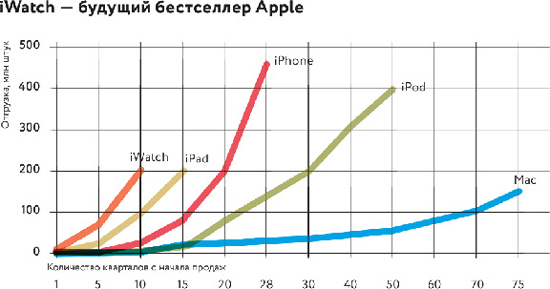 По оценкам аналитиков банка Morgan Stanley, за первый год выхода на рынок объем продаж «умных» часов iWatch может составить около $18 млрд — 58,5 млн экземпляров по $299 за единицу. Если прогноз сбудется, то, судя по истории продаж остальных продуктов Apple, iWatch станут новым звездным кейсом, обогнав по темпам реализации предыдущие хиты.