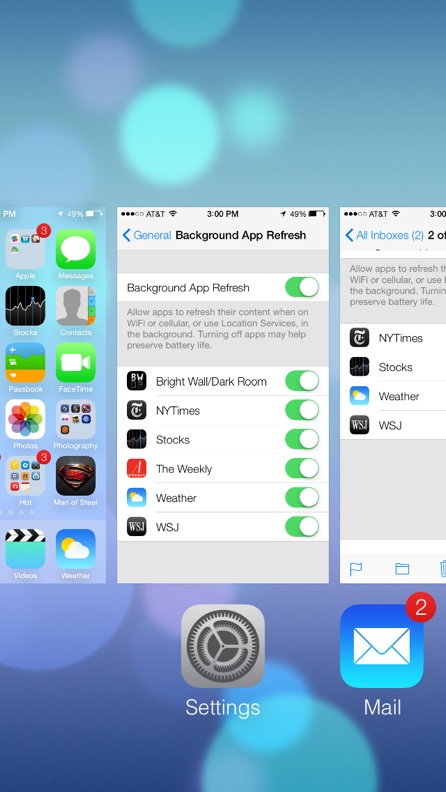 На WWDC`13 про многозадачность iOS 7 говорили немного. Показали экран открытых приложений, выполненный в виде крупных карточек-превью, вскользь упомянули некую избирательную систему фоновых обновлений. Примеров ее применения не привели, а зря, ведь функция более чем интересная, да и новаторская к тому же.