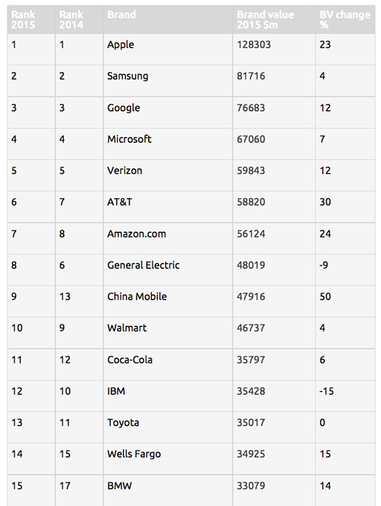В первой десятке большинство корпораций из IT-сектора. В список попали также крупнейшие американские операторы Verizon ($59,8 млрд) и AT&T ($58,8 млрд), онлайн-ритейлер Amazon ($56,1 млрд), торговая сеть Walmart ($46,7) и китайский сотовый провайдер China Mobile ($47,9 млрд), продемонстрировавший самые высокие темпы роста (+50%).