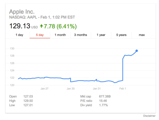 На закрытии торгов 31 января стоимость одной акции Apple составляла $121,35. Соответственно, рыночная капитализация компании, исходя из числа находящихся в обороте акций, указанного Google Finance (5,26 млрд акций), составляла $677,38 млрд. Таким образом, с начала торгов в среду стоимость Apple выросла почти на $40 млрд.