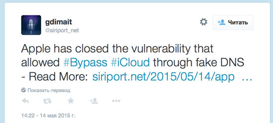 В начале года участники проекта Siriport опубликовали на сайте адрес для обхода функции блокировки Apple. «Бесплатная разблокировка iCloud от Siriport, – говорится в комментариях к записи. – Полная разблокировка iCloud». Речь шла о службе, выступающей в качестве промежуточного звена между iOS-устройствами и iCloud. iPhone и iPad в данном случае ошибочно идентифицировали их как сервер Apple и открывали пользователю полный доступ к устройству.