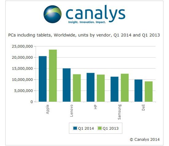 Из других производителей ПК поставки упали только у Samsung, остальные представители первой пятёрки свои показатели с прошлого года увеличили. В целом за первый квартал было поставлено 123,7 млн ПК и планшетов, что по сравнению с годичной давностью равнозначно росту в 5%. На планшеты из этого числа пришлось 41% (50,8 млн.), тогда как ноутбуки занимают 38% поставок. Рост поставок аналитики связывают с прекращением поддержки Windows XP.