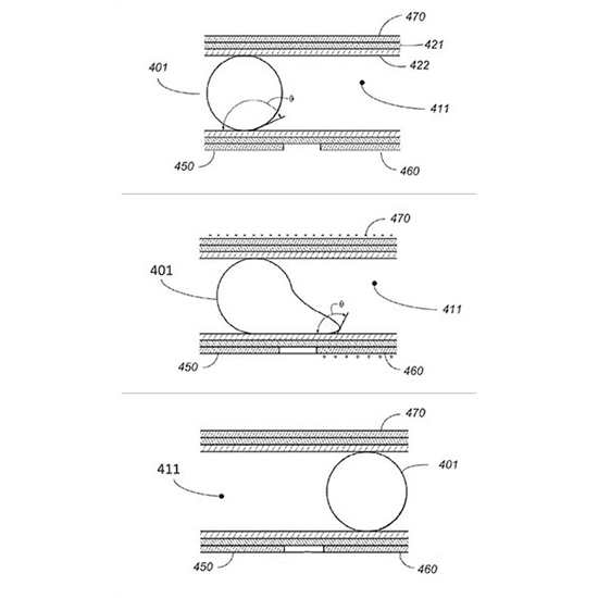 Патент получил название «Удаление жидкостей из отверстий» (Liquid expulsion from an orifice). В ней описывается метод, с помощью которого можно избавиться от воды или любой другой жидкости из различных полостей мобильных устройств. Идея заключается в наделении гидрофобными свойствами элементов в пределах акустических отверстий (динамиков или микрофонов) путем изменения проводимого электрического разряда.
