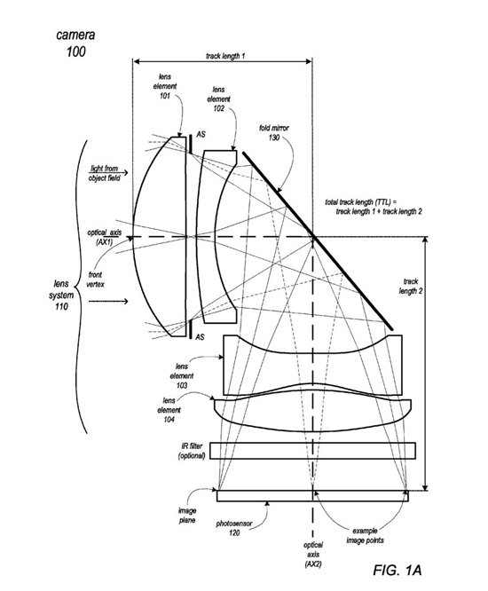 На сайте Бюро патентов и торговых знаков США опубликована заявка Apple под названием «Камера со складной системой телеобъектива». В ней изображена камера смартфона, использующая принцип объективов некоторых компактных камер: зеркало отражает свет на 90 градусов, благодаря чему CMOS-сенсор располагается не параллельно плоскости экрана, а перпендикулярно. Это позволяет существенно увеличить длину объектива и встроить в смартфон объектив с переменным фокусным расстоянием (другими словами, реализовать оптический зум).