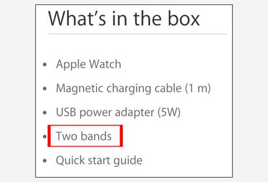 В описании содержимого упаковке Apple Watch обозначено: помимо непосредственно самих часов покупатель получает кабель для зарядки, адаптер питания, пользовательское руководство и два ремешка. Последний факт едва ли допускает возможность двусмысленной трактовки. Пользователи предположили, что речь идет о двух браслетах разных размеров – для большой и маленькой руки.