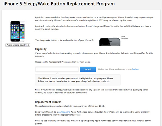 Apple запустила программу бесплатного ремонта смартфонов iPhone 5, в которых были выявлены проблемы с кнопкой Power. В рамках программы «iPhone 5 Sleep/Wake Button Replacement Program» компании обязуются заменить кнопку в случае дефекта даже в том случае, если гарантия на телефон уже закончилась. На сегодня программа объявлена в США и Канаде, со 2 мая она распространится и на другие страны.