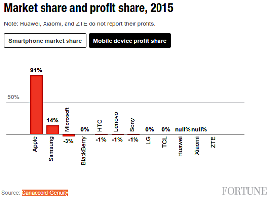 По информации аналитической компании Canaccord Genuity, в 2015 году целый 91 процент от мировой выручки с продаж смартфонов достался Apple. И это притом что доля iPhone на рынке по итогам того же года составила чуть более 17%.