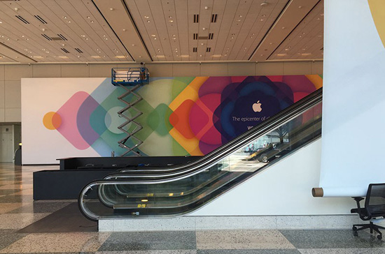Компания Apple завершила подготовку к проведению Всемирной конференции разработчиков. Выставочный комплекс Moscone West украшен логотипами компании, внутри здания развешаны тизерные баннеры с надписью «Эпицентр изменений. WWDC 2015».