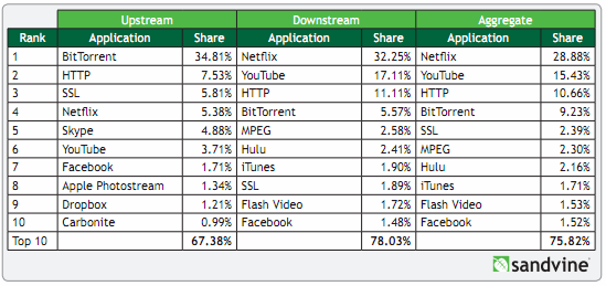 Наиболее заметно присутствие BitTorrent в upload-трафике, который идет со стороны пользователей. Здесь с торрентами (34,8%) вообще никто не может сравниться (см. таблицу).