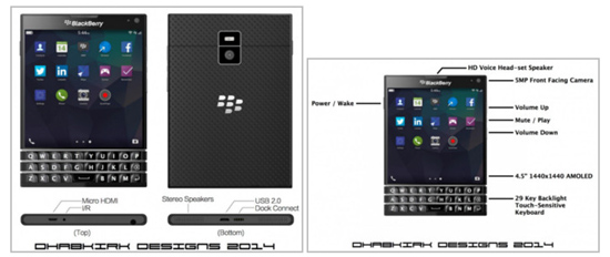 Дизайнер Дилан Хабкерк (Dylan Habkirk) нарисовал рендеры смартфона. Есть некоторые расхождения с вышенаписанным (кнопка на левом торце, 5-Мп фронтальная камера, да и о стереодинамиках на нижней панели никто не говорил, как и о коннекторе для дока), однако рендер даёт весьма точное представление о размерах смартфона, что даёт возможность сравнить его с другими представителями линейки BlackBerry.