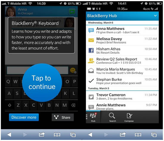 Специальный сайт BlackBerry.com/glimpse представляет из себя веб-приложение с интерфейсом операционной системы BlackBerry 10. При помощи эмулятора можно опробовать управление жестами, а также просмотреть ключевые функции BlackBerry 10.