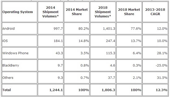 Если BlackBerry постепенно исчезает с рынка, то Windows Phone, напротив, наращивает своё присутствие. Специалисты ожидают, что в период между 2014 и 2018 годами доля этой «операционки» от Microsoft в глобальных поставках «умных» телефонов возрастёт с 3,5 % до 6,4 %. iOS за это же время ослабит свои позиции и через четыре года получит долю в размере 13,7 % против 14,8 %, ожидаемых по итогам нынешнего года.