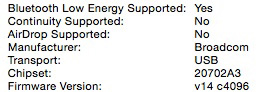 В качестве тестового экземпляра выбрали модуль Bluetooth 4.0 USB Micro Adapter производства IOGEAR, его подключили к MacBook Air выпуска 2010 года. И хотя ноутбук со «свистком» позволяет обмениваться данными по новому интерфейсу, компьютер по-прежнему не работает с Handoff и AirDrop. Черным по белому об этом говорится в разделе информации об ОС.