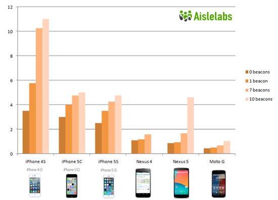 Специалисты отметили улучшенный алгоритм поиска ближайших Bluetooth-маяков у смартфонов Apple. Но для этого разработчикам приходится затрачивать дополнительное время на оптимизацию приложений. В свою очередь, смартфон Moto G демонстрирует впечатляющие показатели энергопотребления даже при простом фоновом поиске таких маяков, который является стандартным для смартфонов с Android.