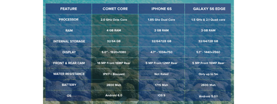 Водонепроницаемость стала самой впечатляющей неанонсированной особенностью новых iPhone и их предшественников. Однако в том, что Apple не акцентировала внимание на влагозащищенности iPhone 6s и 6s Plus, может быть и скрытый смысл – так, производитель не отремонтирует и не заменит «утопленника» по гарантии. В Comet, напротив, водонепроницаемость стала главной «фишкой» смартфона. Более того: тонкий стильный гаджет не тонет, а значит, вы не потеряете его на дне бассейна или озера.