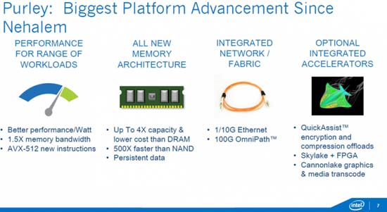 Платформа Purley станет самым основательным усовершенствованием серверов на основе Intel Xeon в этом десятилетии, когда крупнейший в мире производитель центральных процессорных устройств представит её в 2017 году. Intel намеревается выпустить три версии микросхем Xeon для платформы Purley: Skylake-EP, Skylake-EX и Skylake-F. Новые процессоры будут включать в себя до 28 ядер на базе микроархитектуры Skylake с технологией Hyper-Threading и 512-разрядными расширениями AVX версии 3, шесть каналов работы с памятью типа DDR4, до 48 линий PCI Express 3.0, два или три канала шины нового поколения UltraPath Interconnect (UPI), а также поддерживать технологию передачи данных OmniPath.