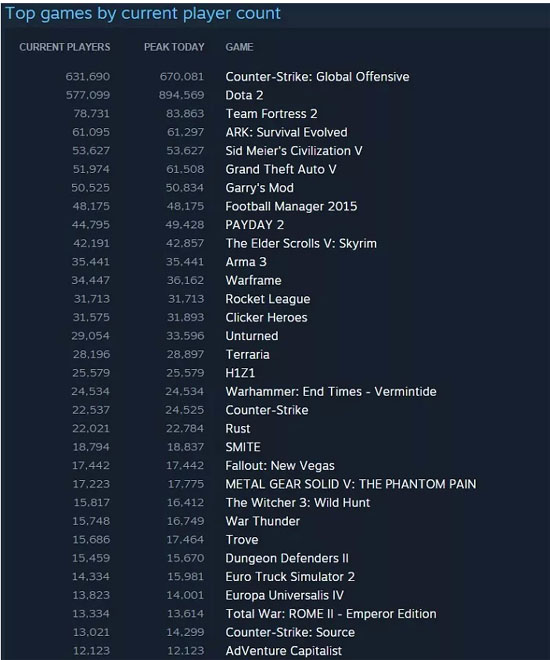 Одновременно свыше 11.6 миллионов человек были залогинены в Steam. Как говорит статистика площадки, Counter Strike: Global Offensive взяла пальму первенства в этот пик активности — 670,081 игроков. Dota 2 оказалась на втором месте, на третьем — Team Fortress 2 и четвёртом — ARK: Survival Evolved. Старушка Civilization V замыкает пятёрку этого хит-парада.