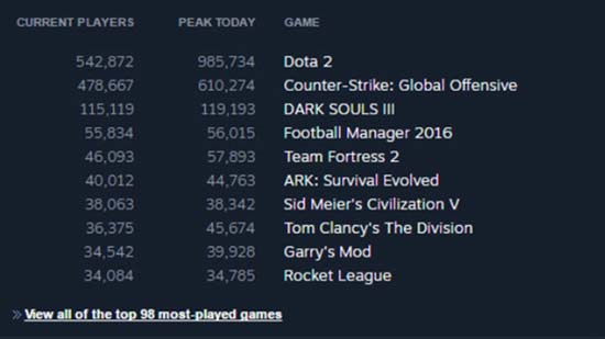 Третья часть хардкорной серии Dark Souls обошла по популярности все игры в сети Steam за исключением бессменных лидеров, выпущенных Valve. Dark Souls 3 заняла третью позицию в списке игр с наибольшим онлайном после Dota 2 и Counter-Strike: Global Offensive.